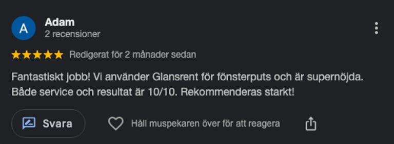 Mycket nöjd med fönsterputsningen! Professionellt och snabbt, jag kommer definitivt boka igen.